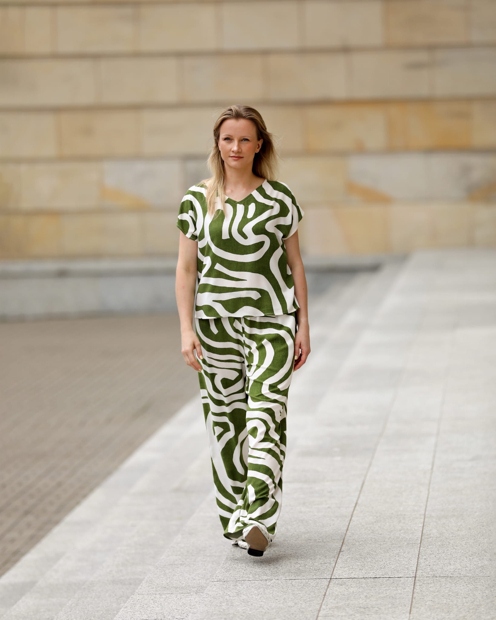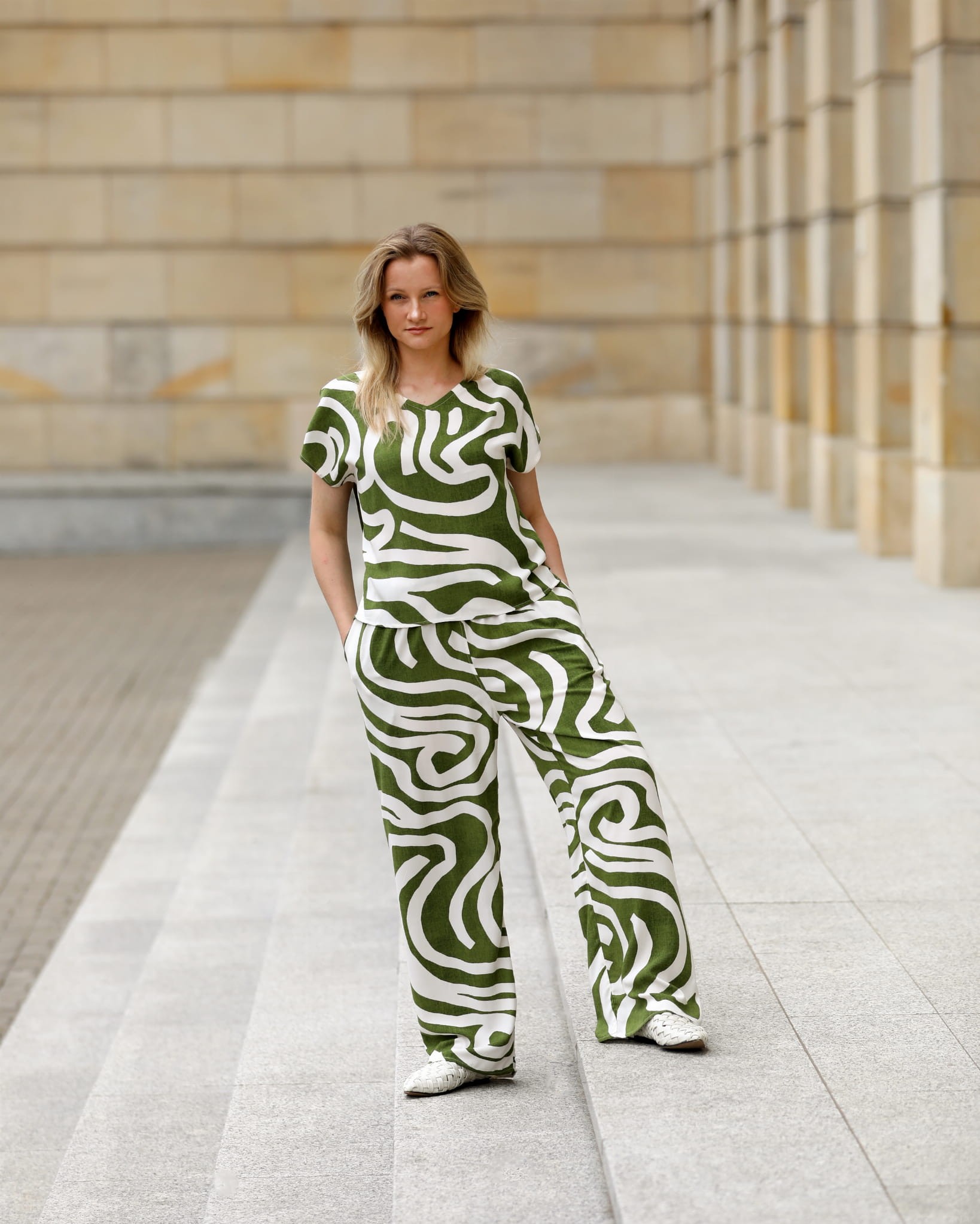 Swobodna bluzka z krótkim rękawem o luźnym, pudełkowym kroju. Dekolt w kształcie litery V. Bluzka wykonana jest z wysokogatunkowej leciutkiej i chłodnej w chwycie wiskozy. Rewelacyjny biały wzór na niejednolitym zielonym tle tworzy świetny efekt. W połączeniu ze spodniami z tej samej tkaniny tworzą komplet, który może udawać efektowny kombinezon:)