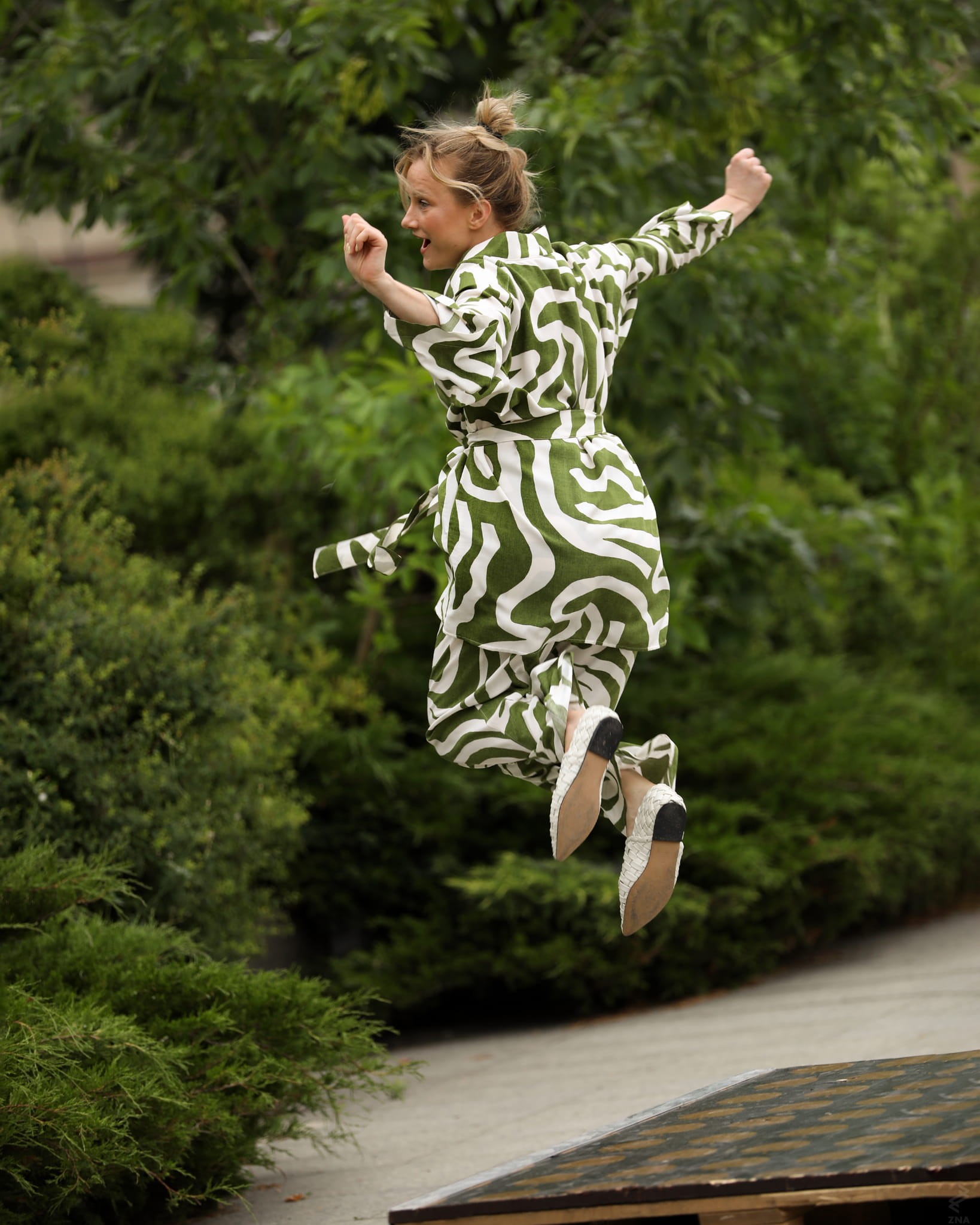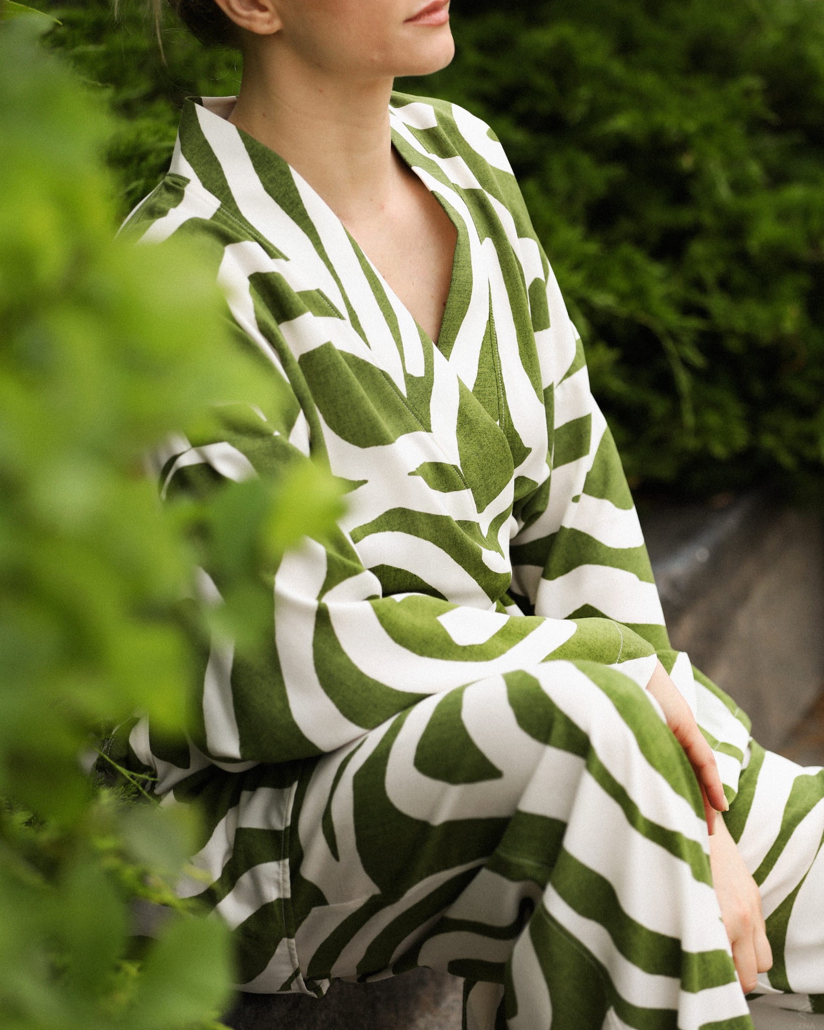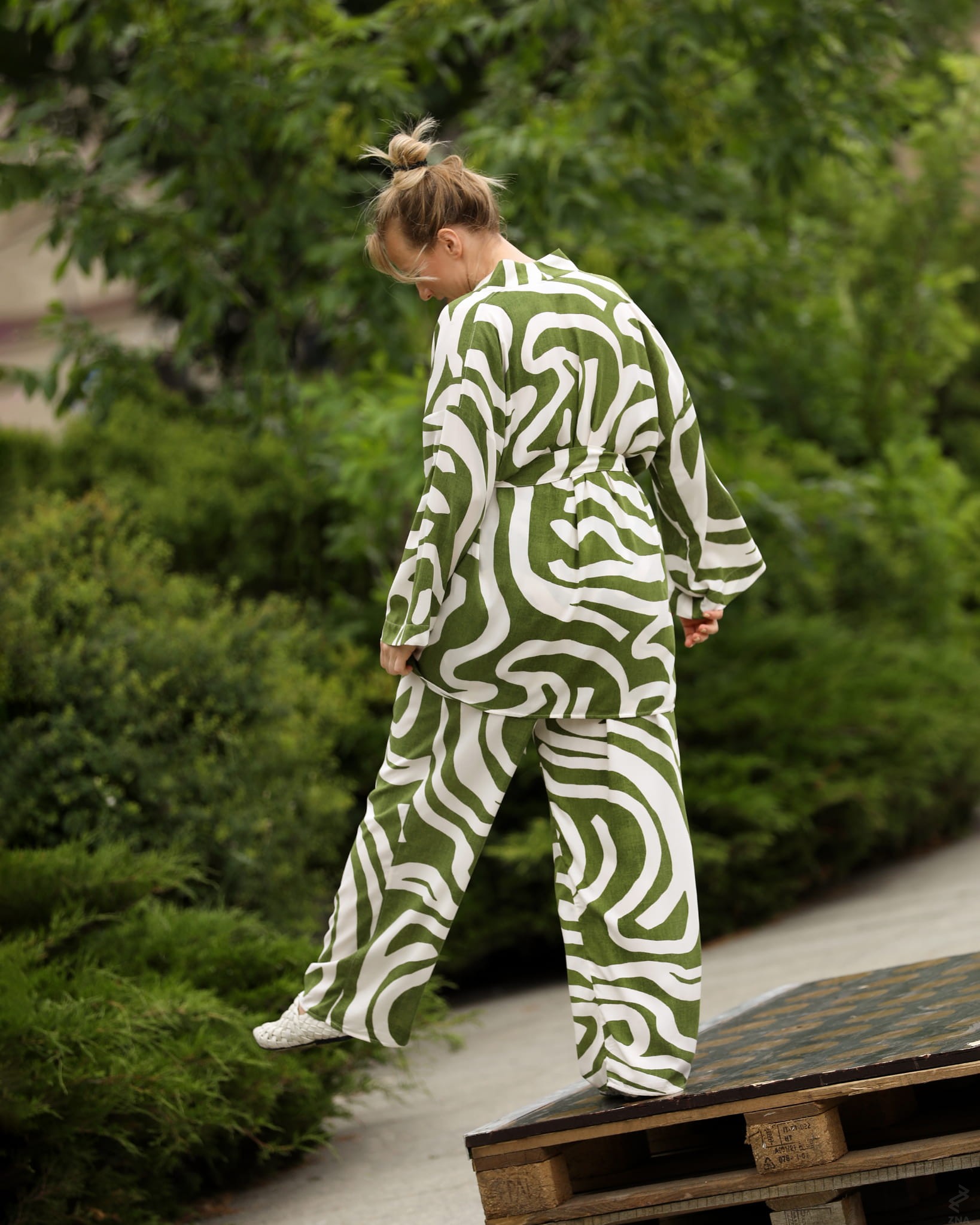 Rewelacyjny biały wzór na niejednolitym zielonym tle tworzy świetny efekt. W połączeniu ze spodniami z tej samej tkaniny tworzą genialny komplet.
