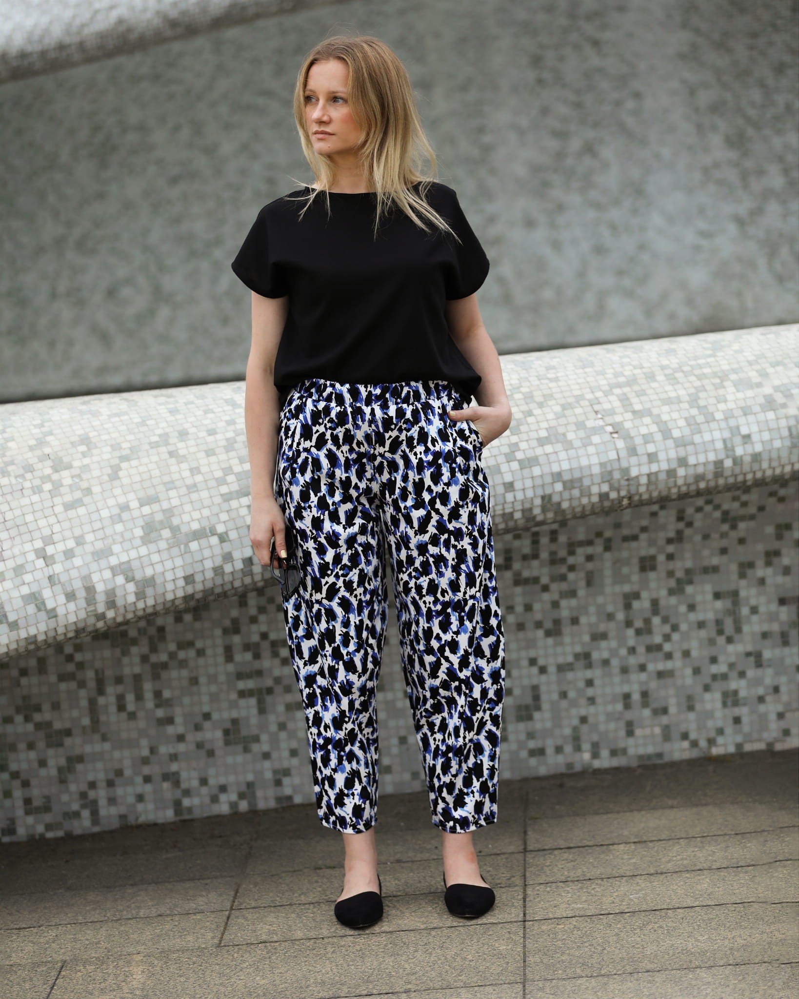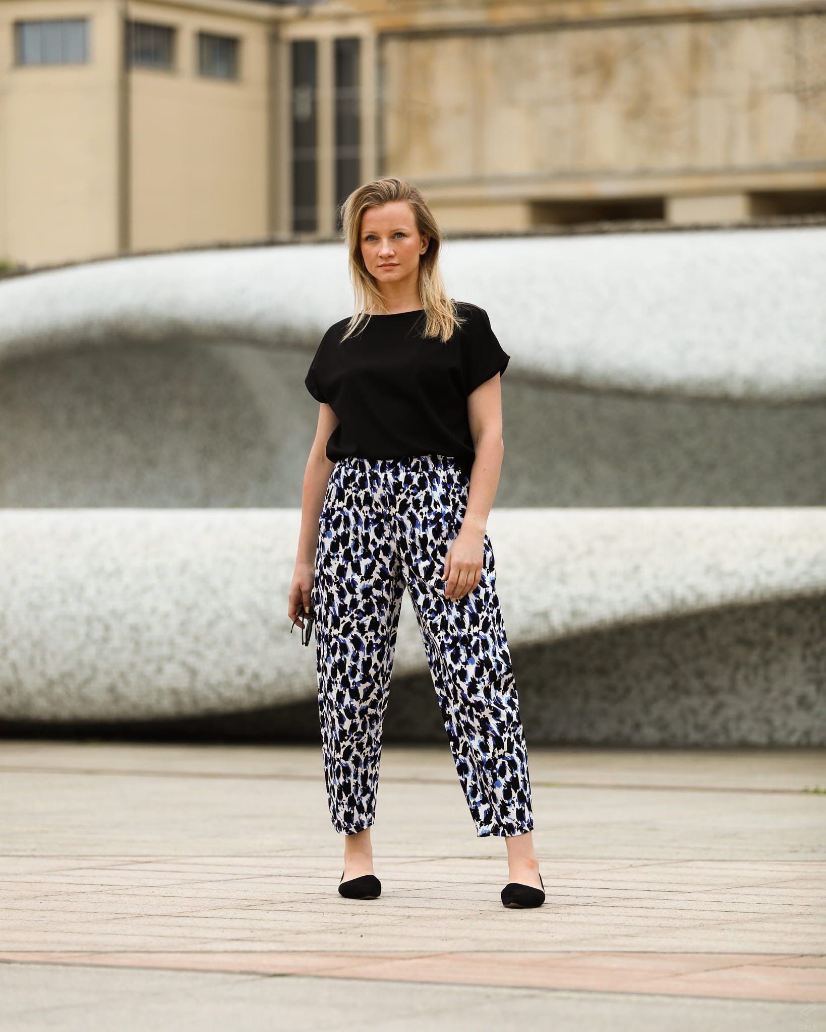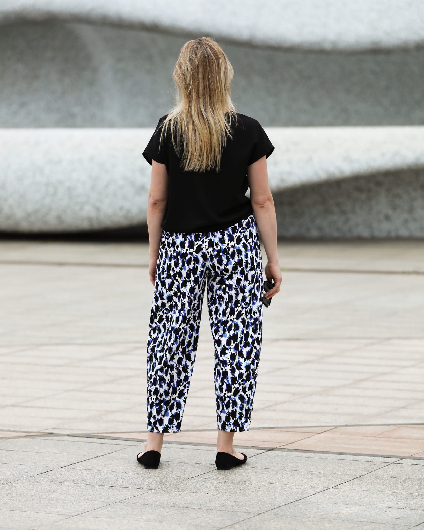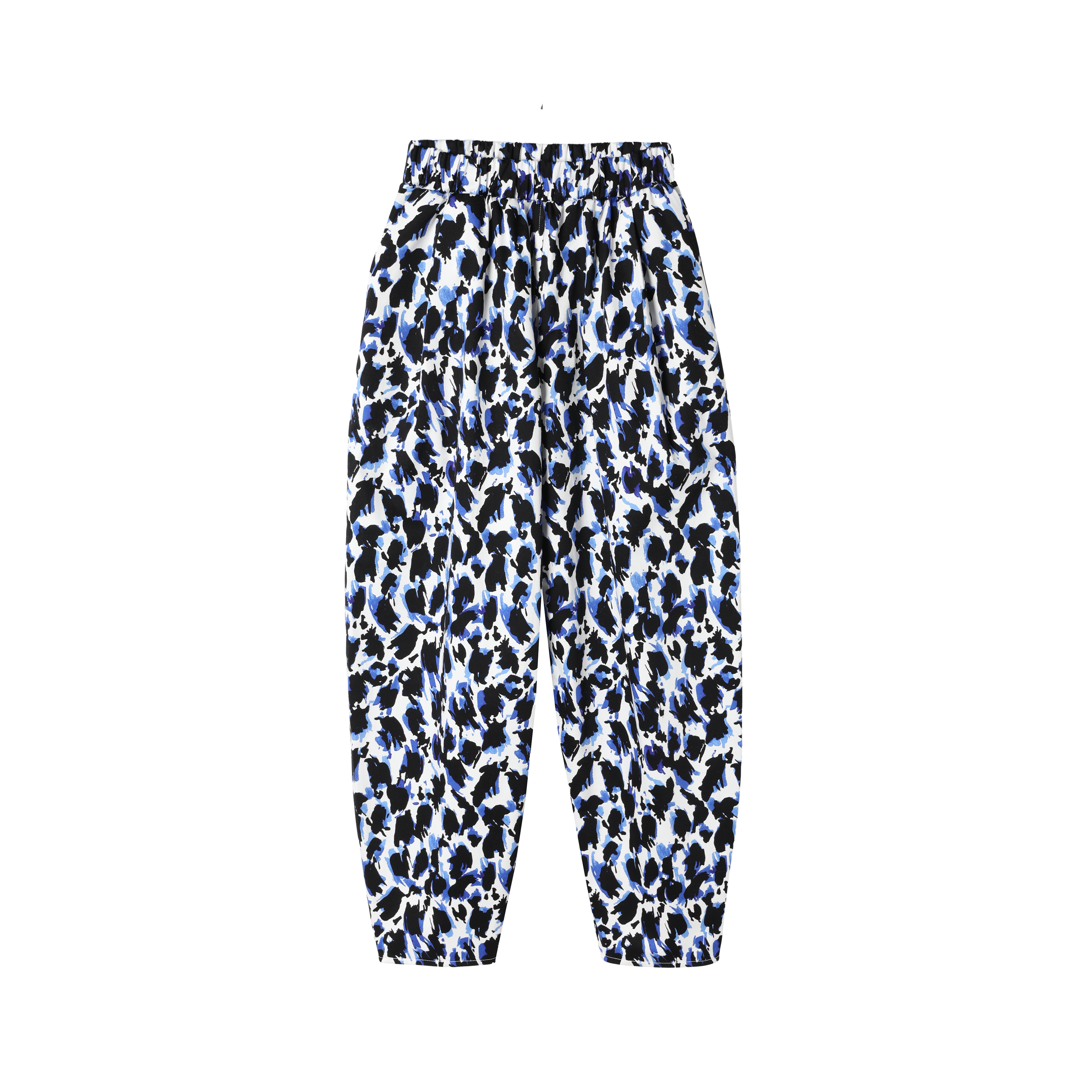 Fajne i bardzo wygodnie szerokie, zwężane ku dołowi spodnie o długości 7/8. Wykonane z wysokogatunkowej tkaniny bawełnianej z lekkim satynowym wykończeniem. Śmietankowe tło tkaniny zdobią spore czarno fiołkowe cętki. Całość prezentuje się bardzo oryginalnie.