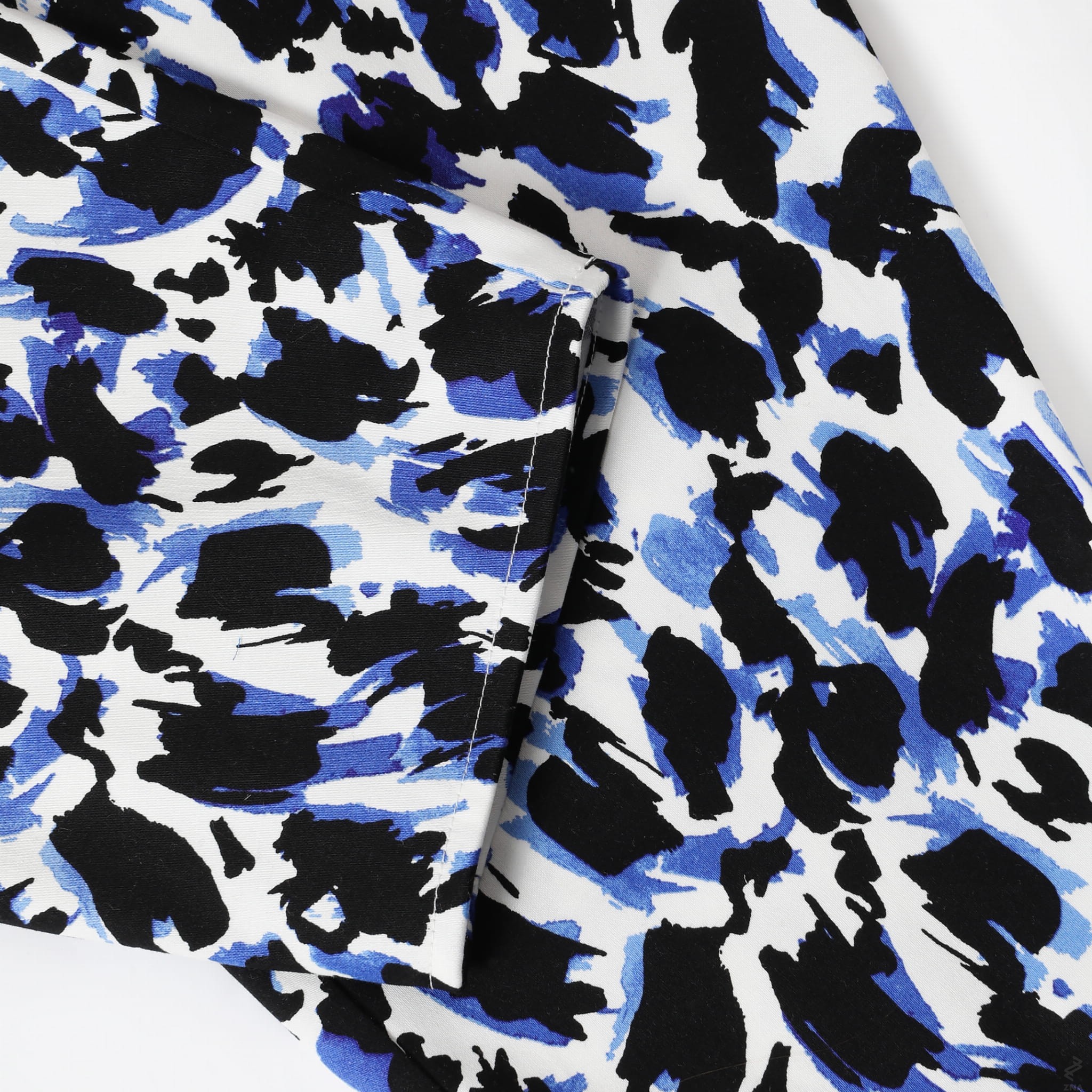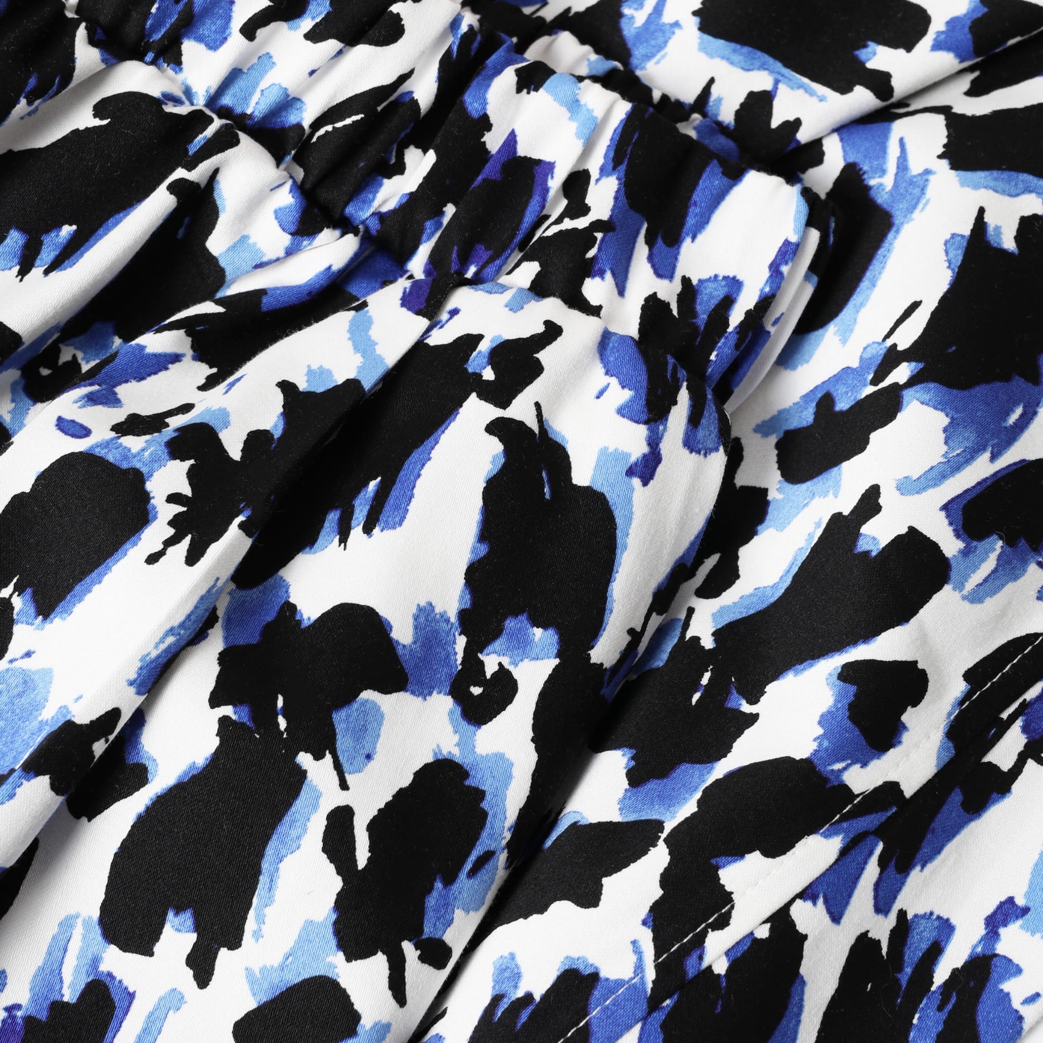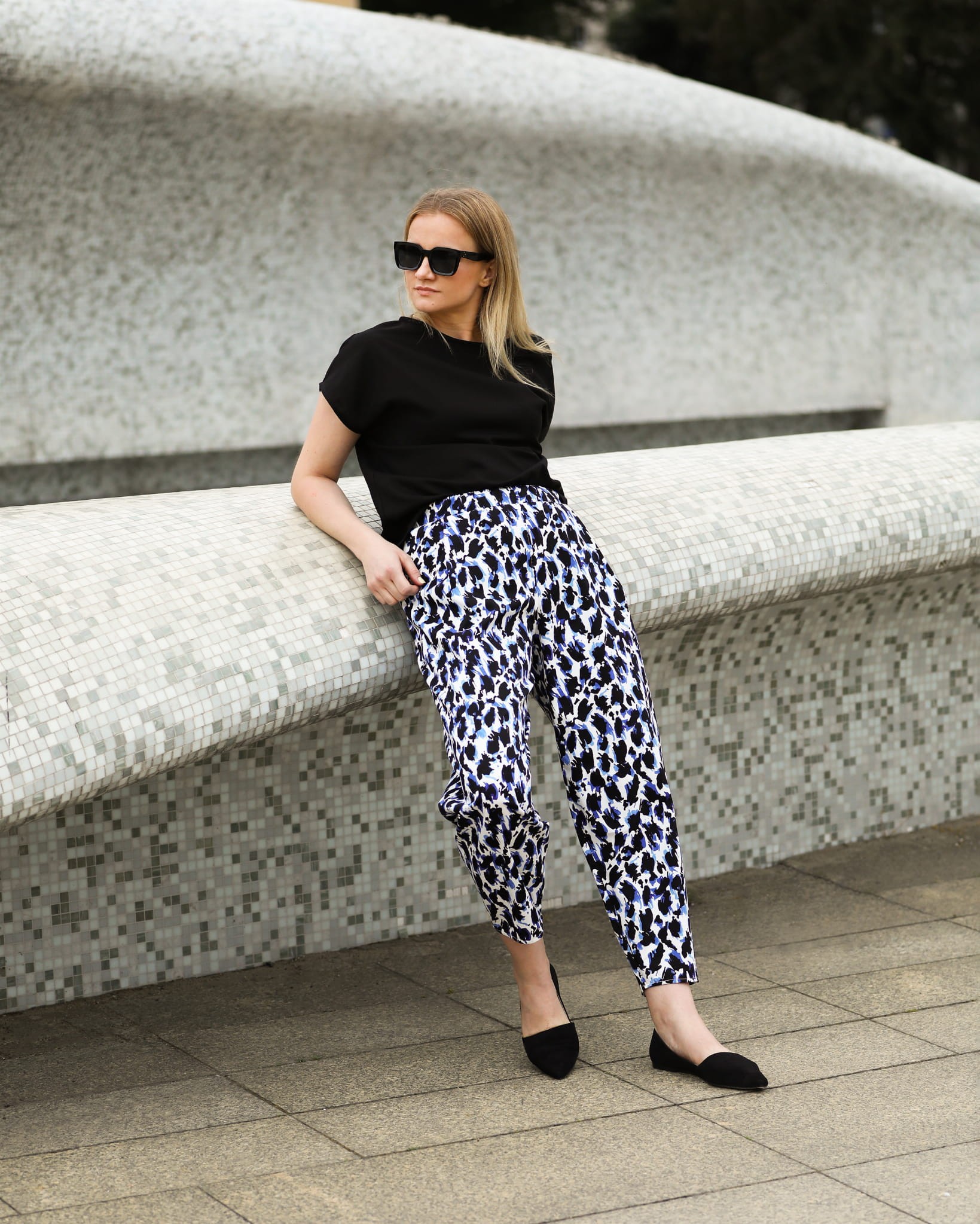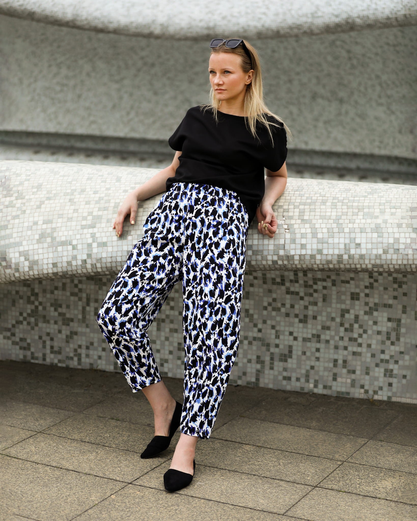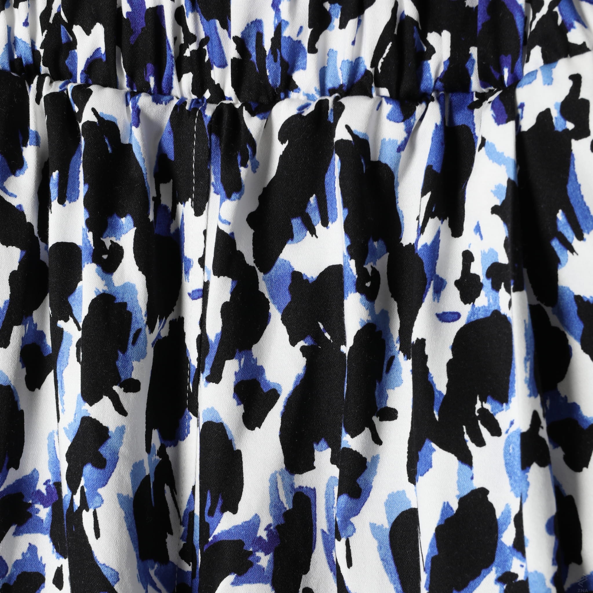 Fajne i bardzo wygodnie szerokie, zwężane ku dołowi spodnie o długości 7/8. Wykonane z wysokogatunkowej tkaniny bawełnianej z lekkim satynowym wykończeniem. Śmietankowe tło tkaniny zdobią spore czarno fiołkowe cętki. Całość prezentuje się bardzo oryginalnie.