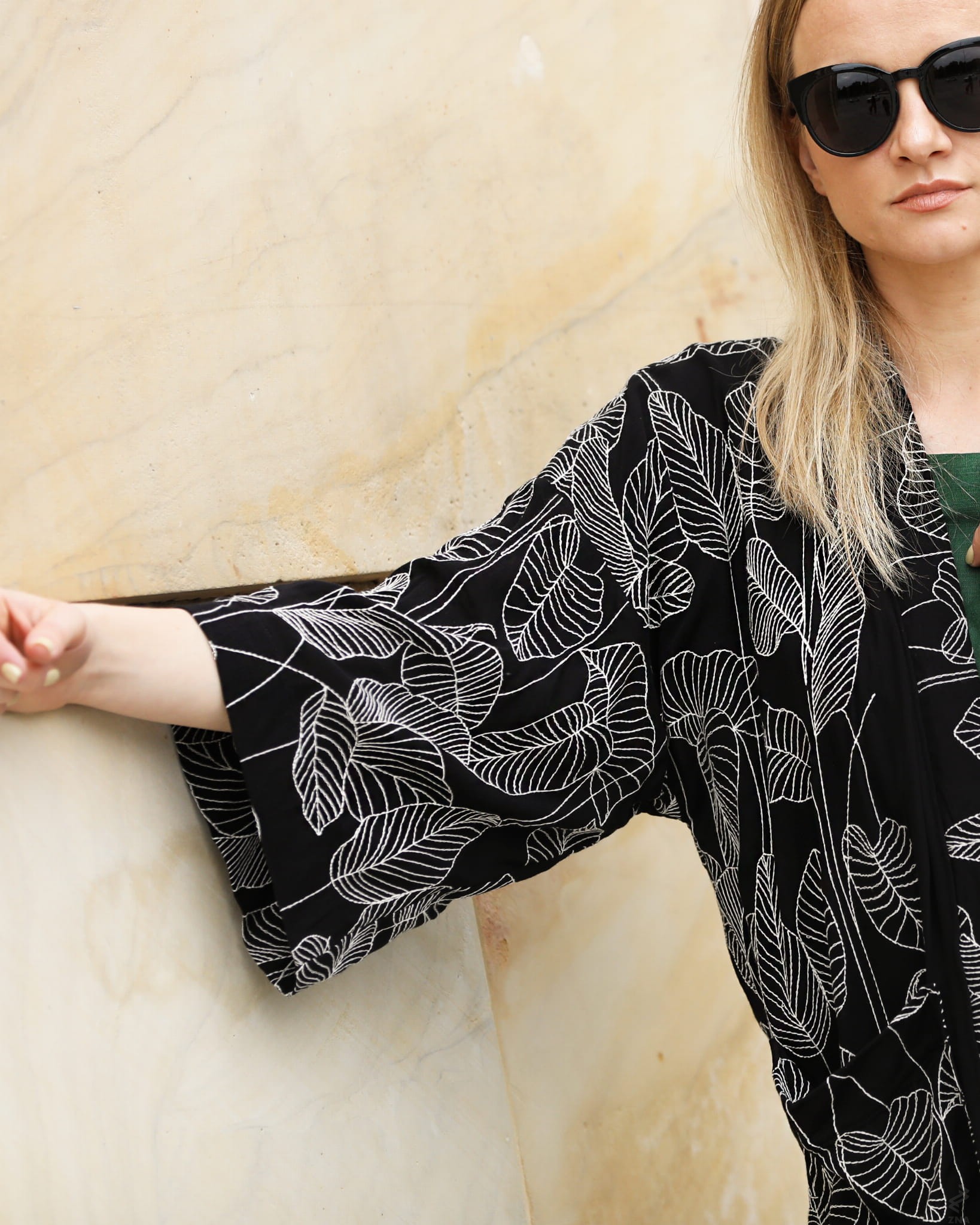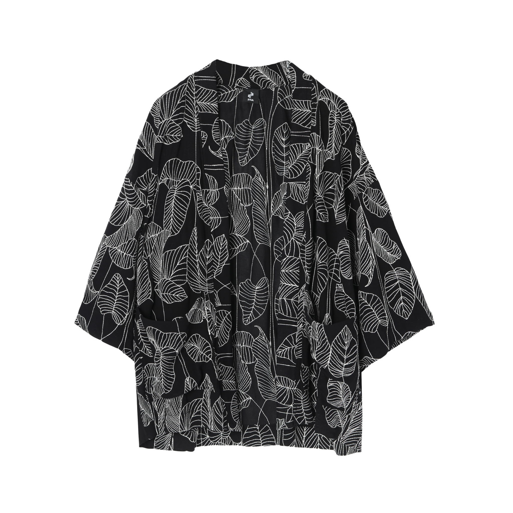 Kimono uszyte jest z delikatnej, lekko transparentnej wiskozy, którą zdobią haftowane ażurowe liście.