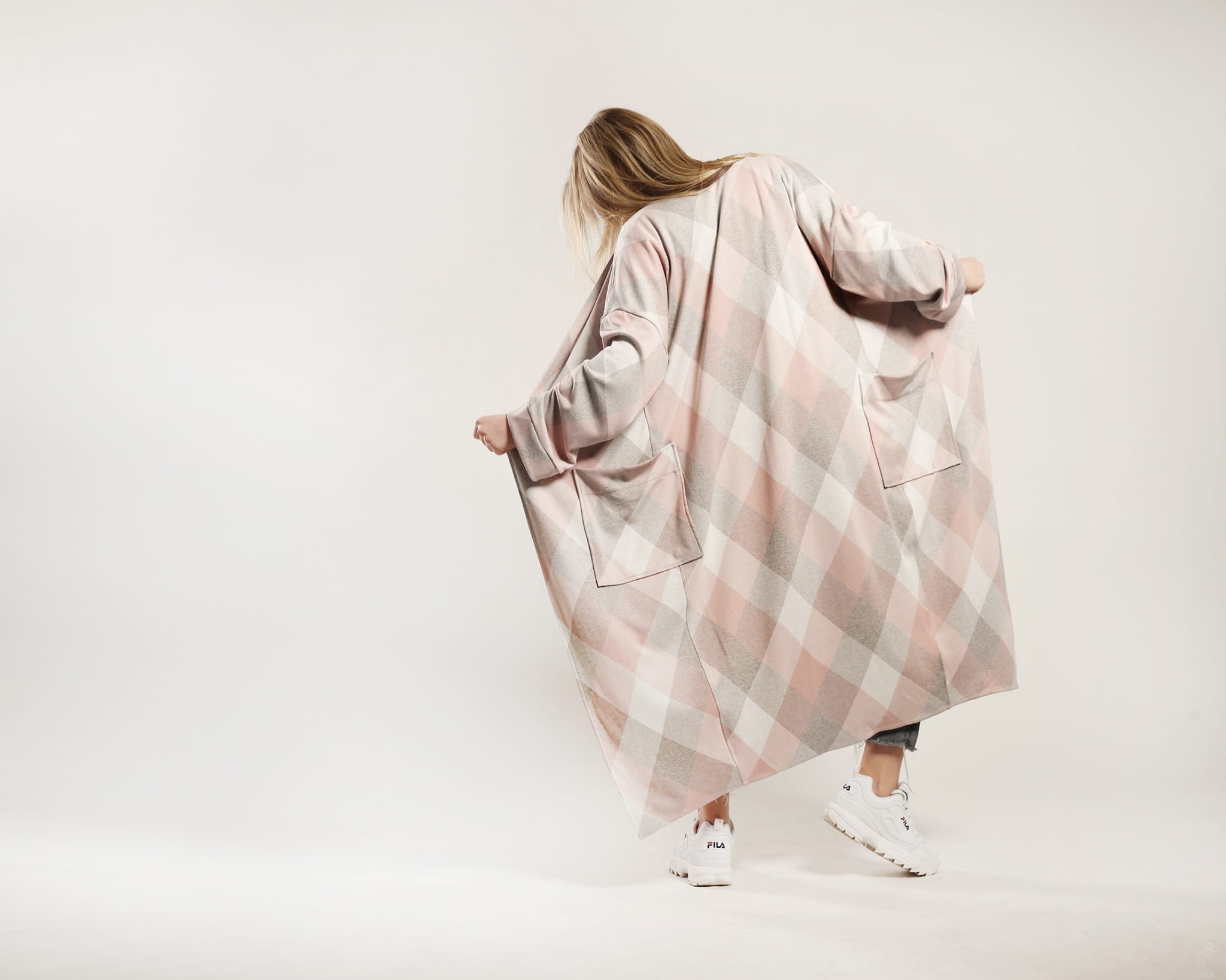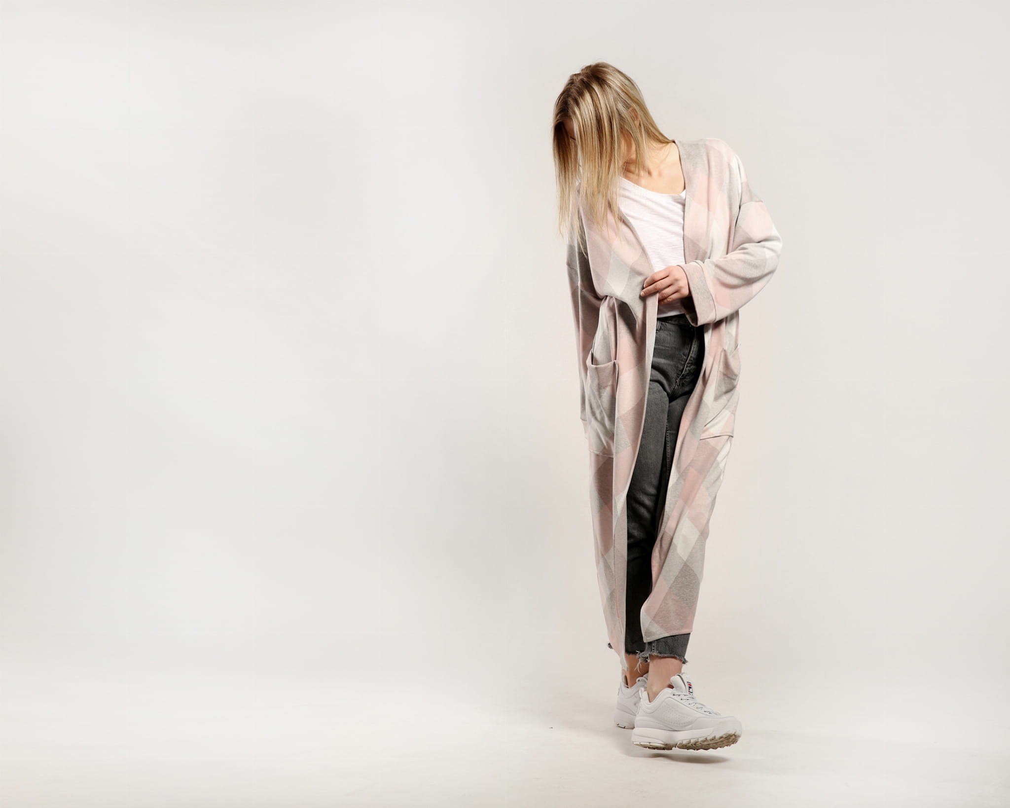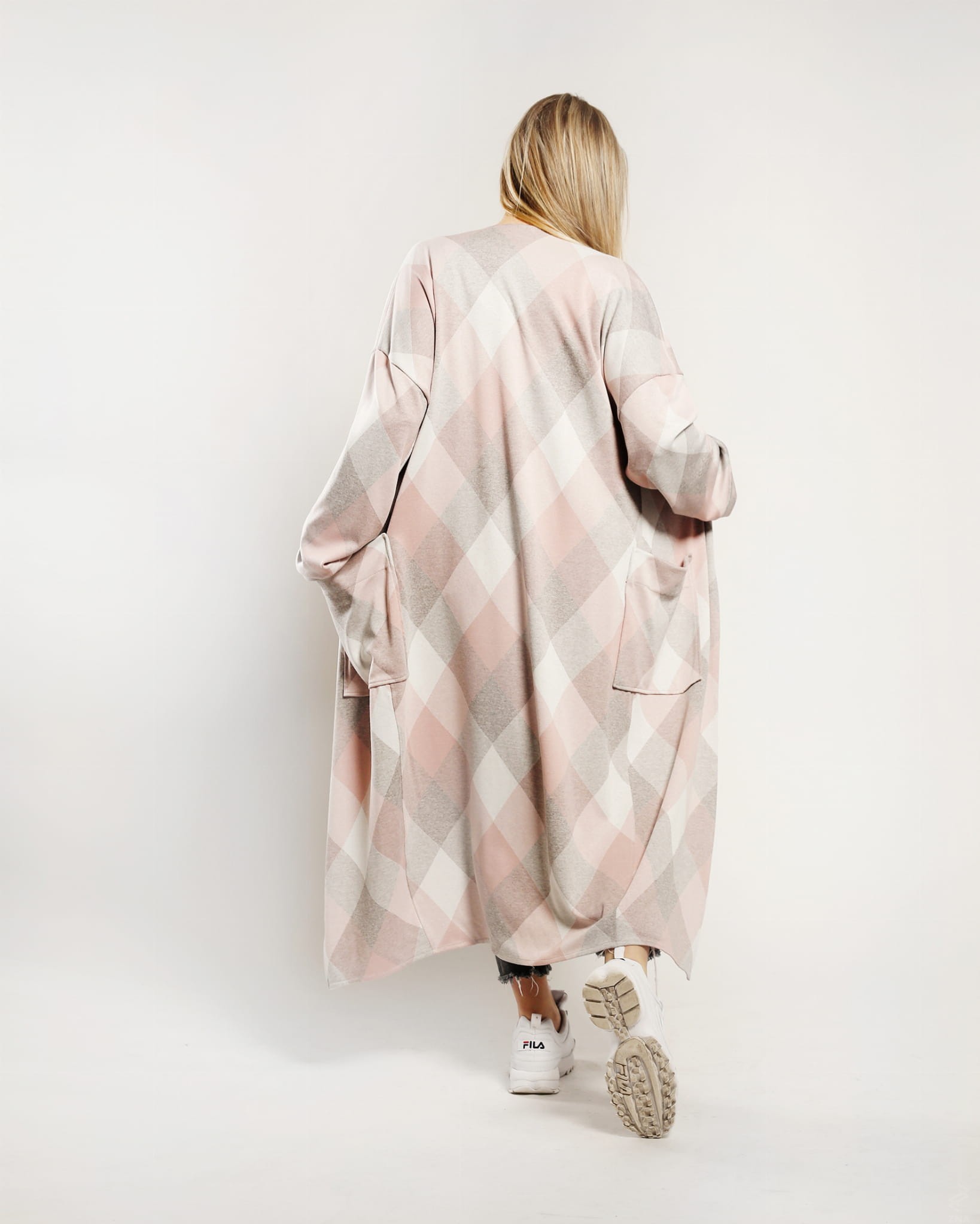 Efektowny i wygodny kardigan sięgający niewiele ponad kostkę. Wykonany z wysokogatunkowej dzianiny w romby w odcieniach różu, szarości i kości słoniowej. Po bokach dwie duże naszywane kieszenie. Obszerne rękawy wykończone szerokim mankietem.