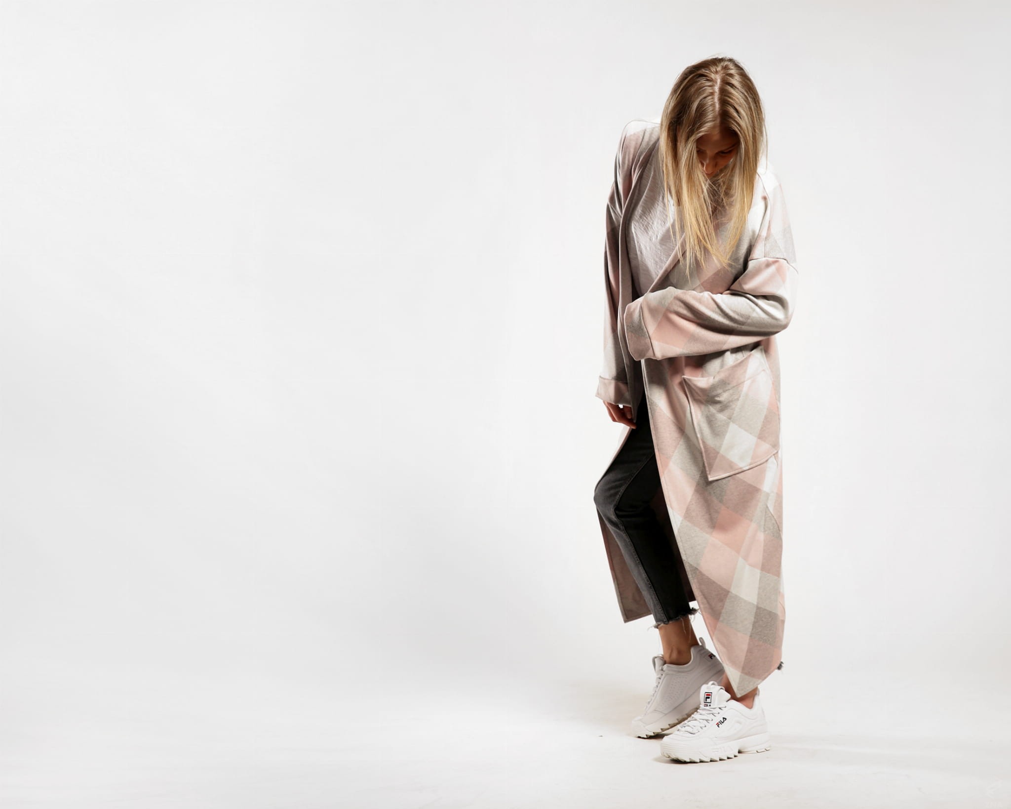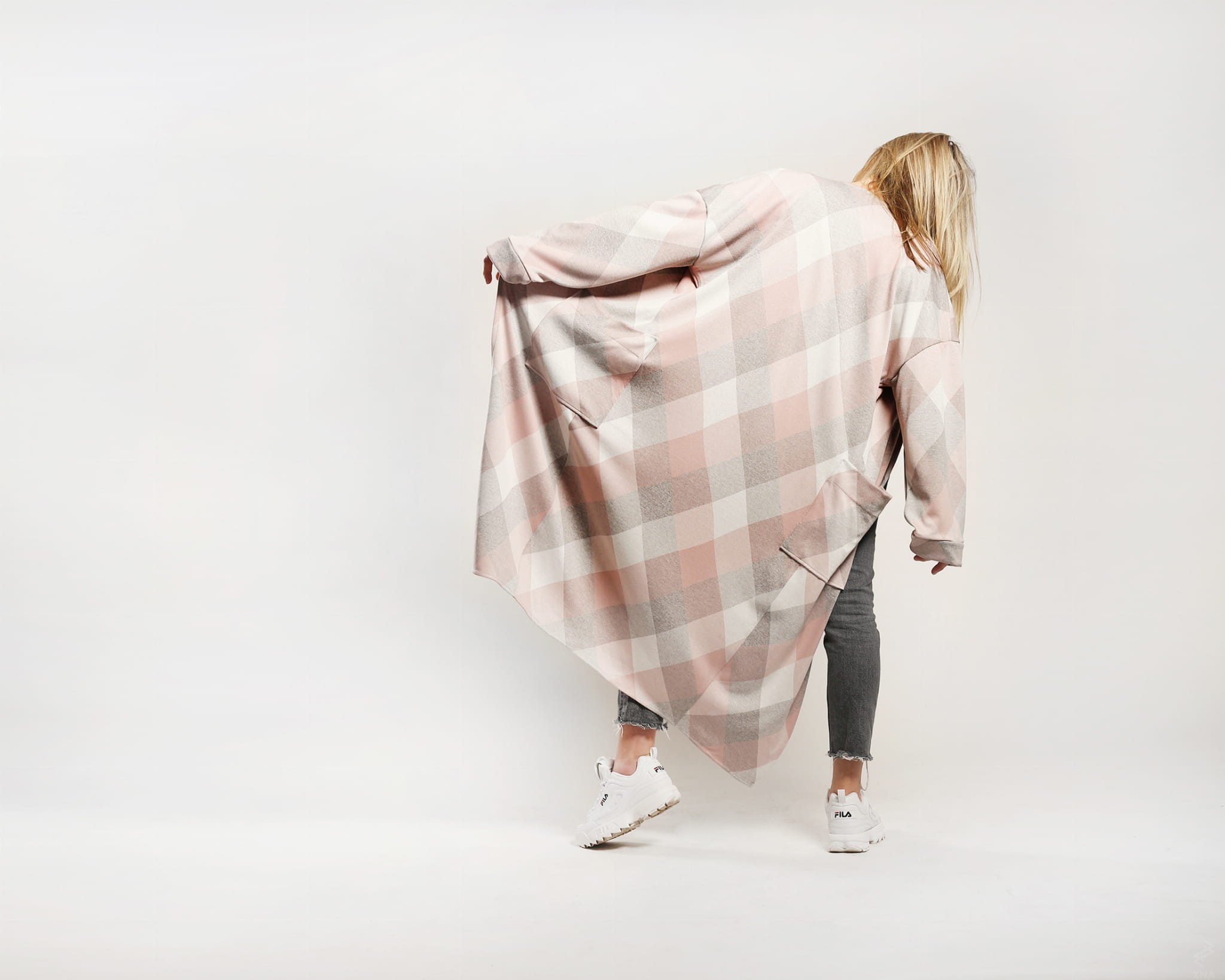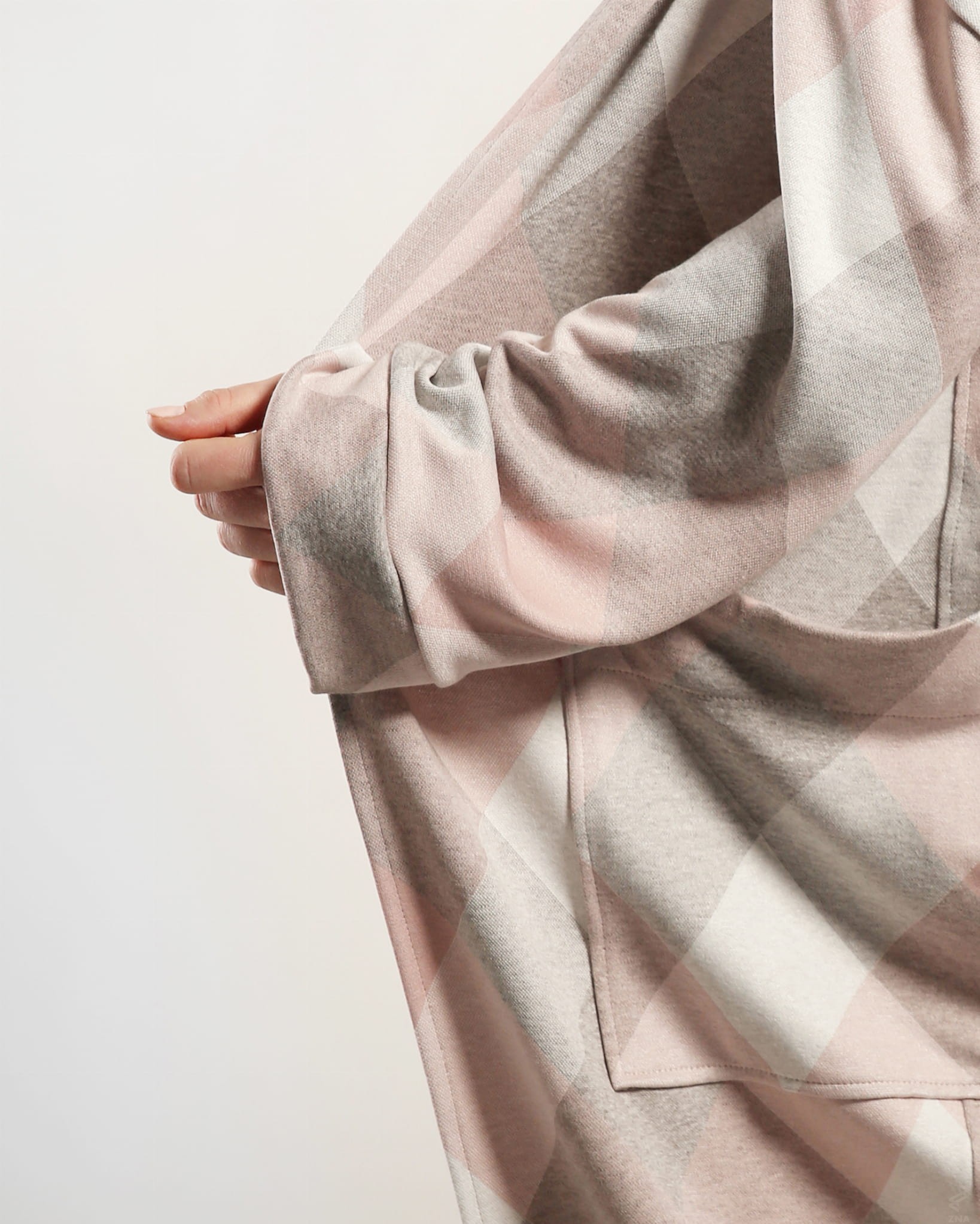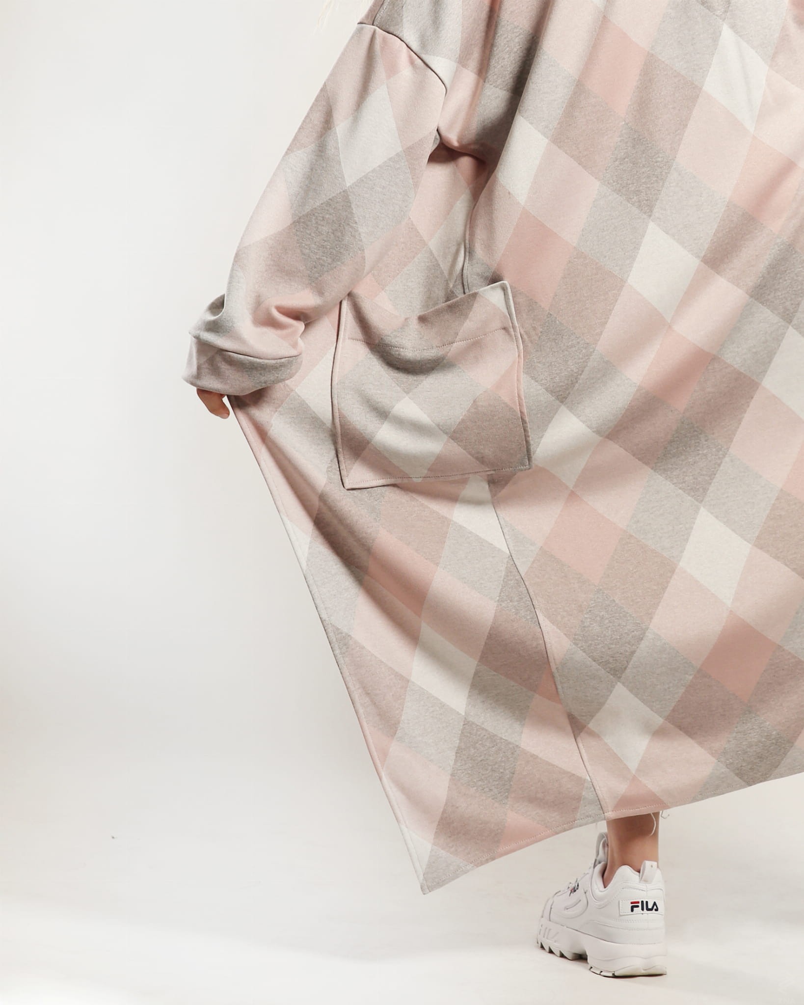 Efektowny i wygodny kardigan sięgający niewiele ponad kostkę. Wykonany z wysokogatunkowej dzianiny w romby w odcieniach różu, szarości i kości słoniowej. Po bokach dwie duże naszywane kieszenie. Obszerne rękawy wykończone szerokim mankietem.