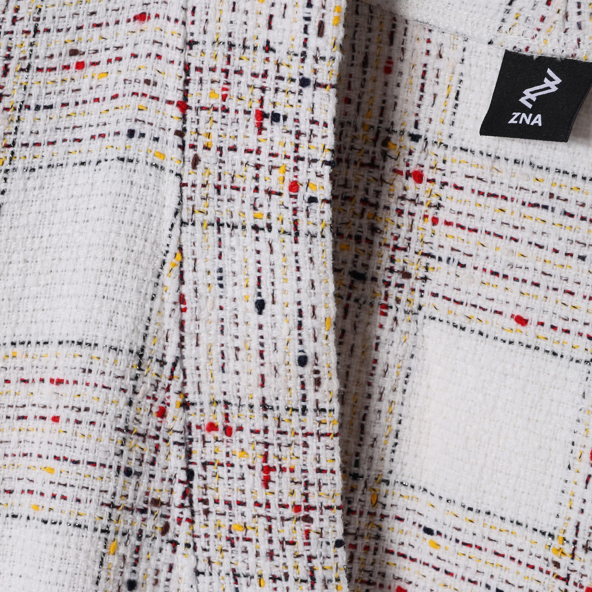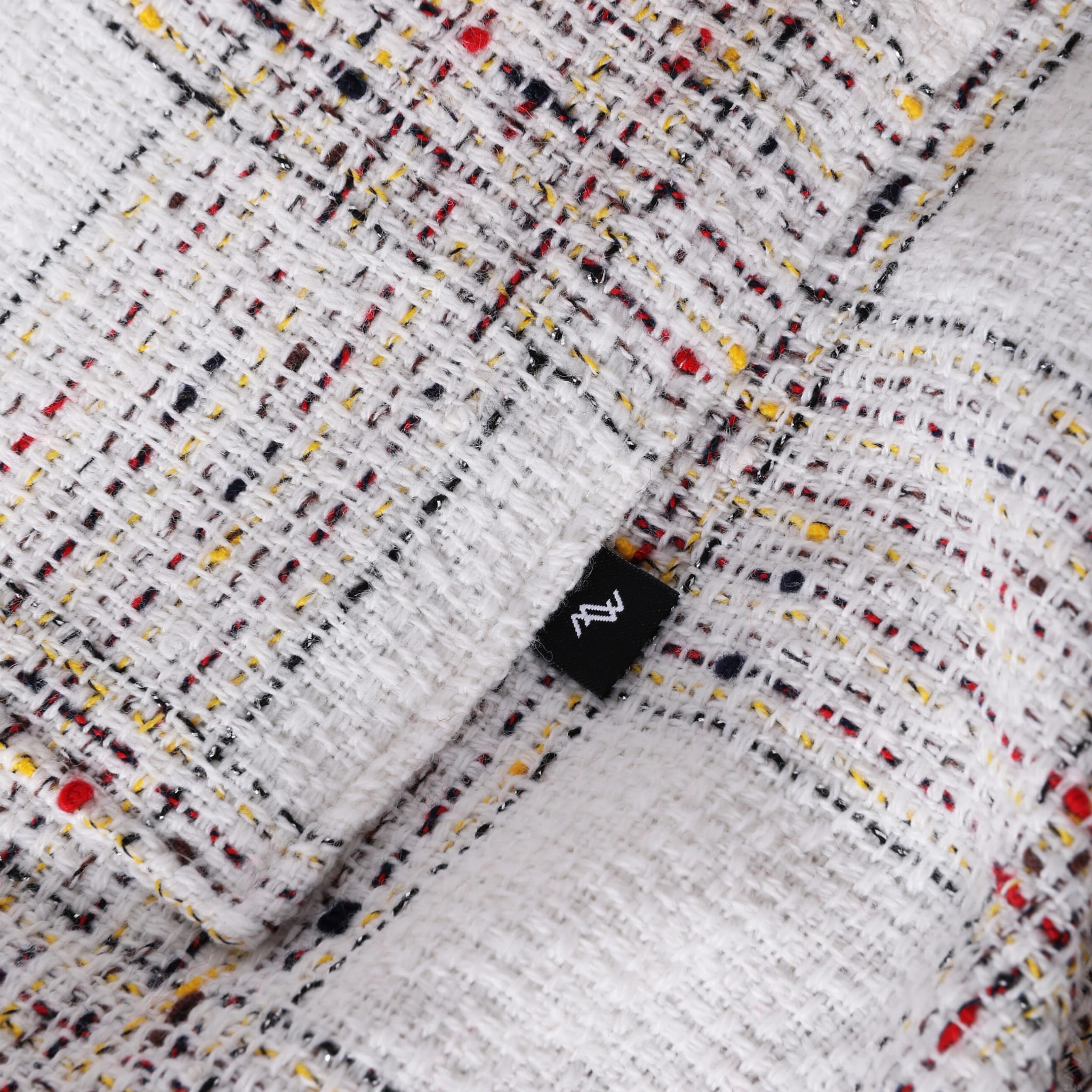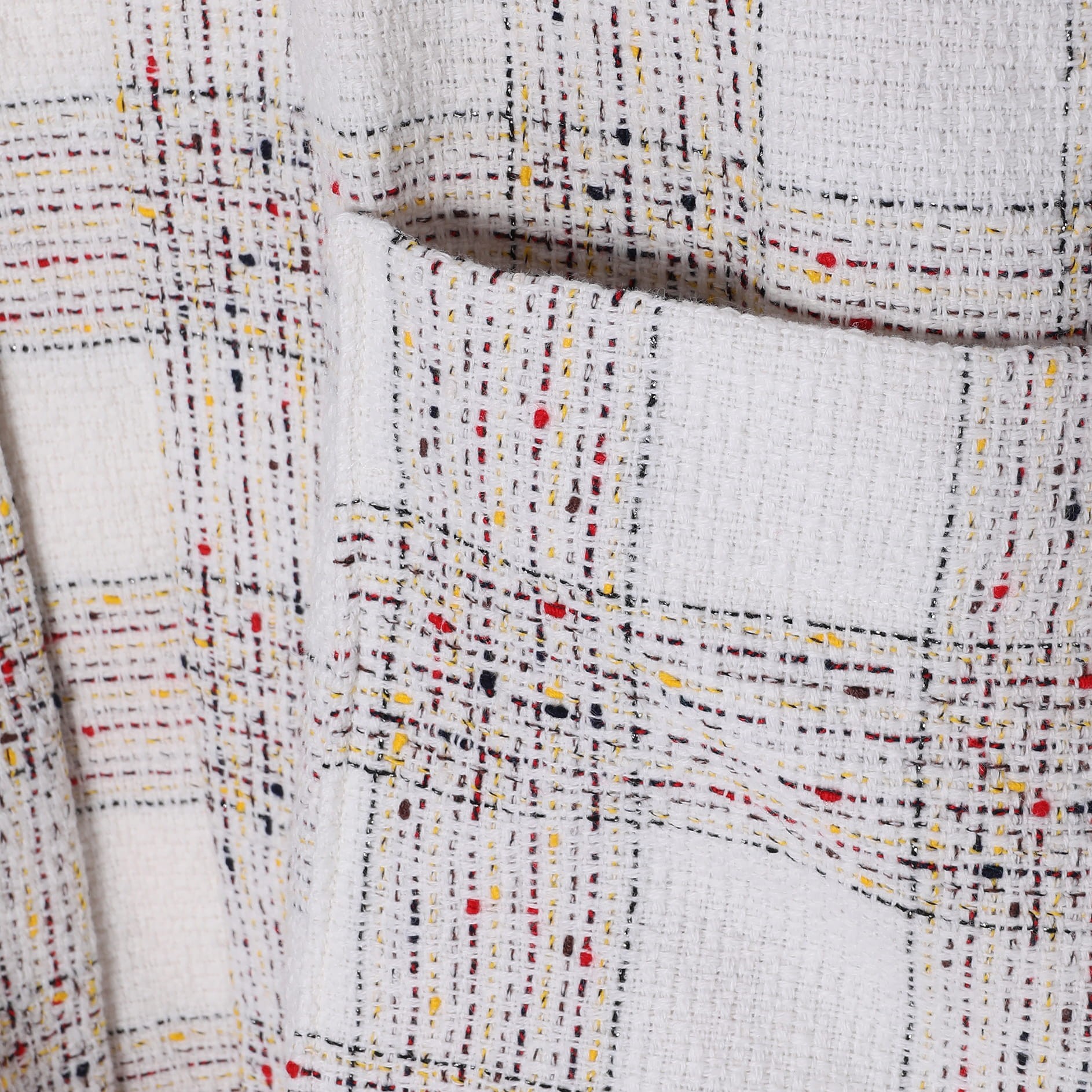 Bawełniana chanelka przepleciona jest delikatnymi kolorowymi pasmami, które tworzą ażurową kratę. Gdzieniegdzie połyskują srebrne drobinki nici lurexu. Całość na tle jasnego, śmietankowego beżu.
