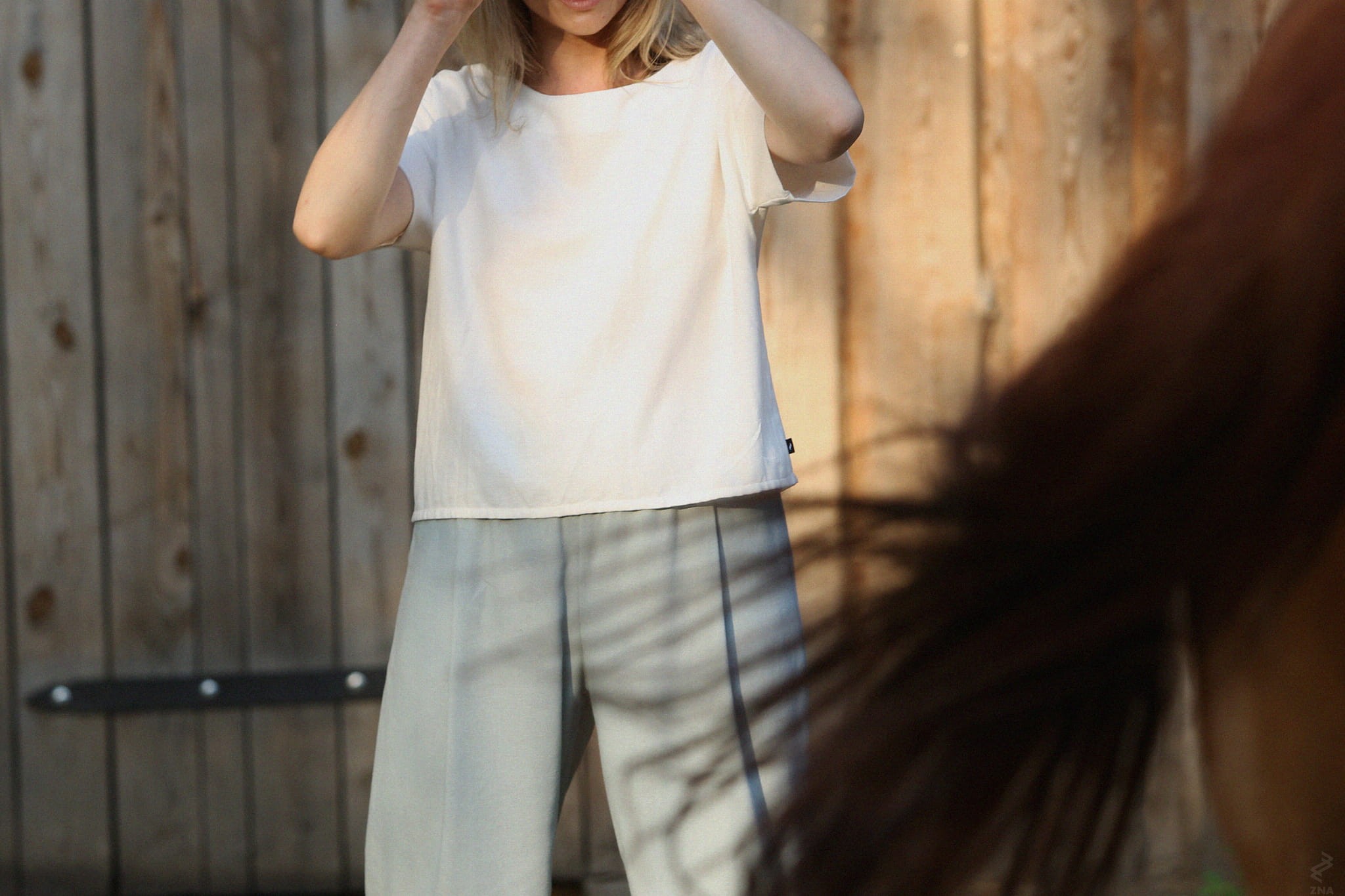Swobodna bluzka oversize o pudełkowym kroju. Krótki rękawek wykończony szerokim mankietem. Wykonana z wysokogatunkowej tkaniny z recyklingu. Oznacza to, że przędza wykorzystana do produkcji tego materiału została w całości pozyskana ze starych ubrań lub innych tkanin.