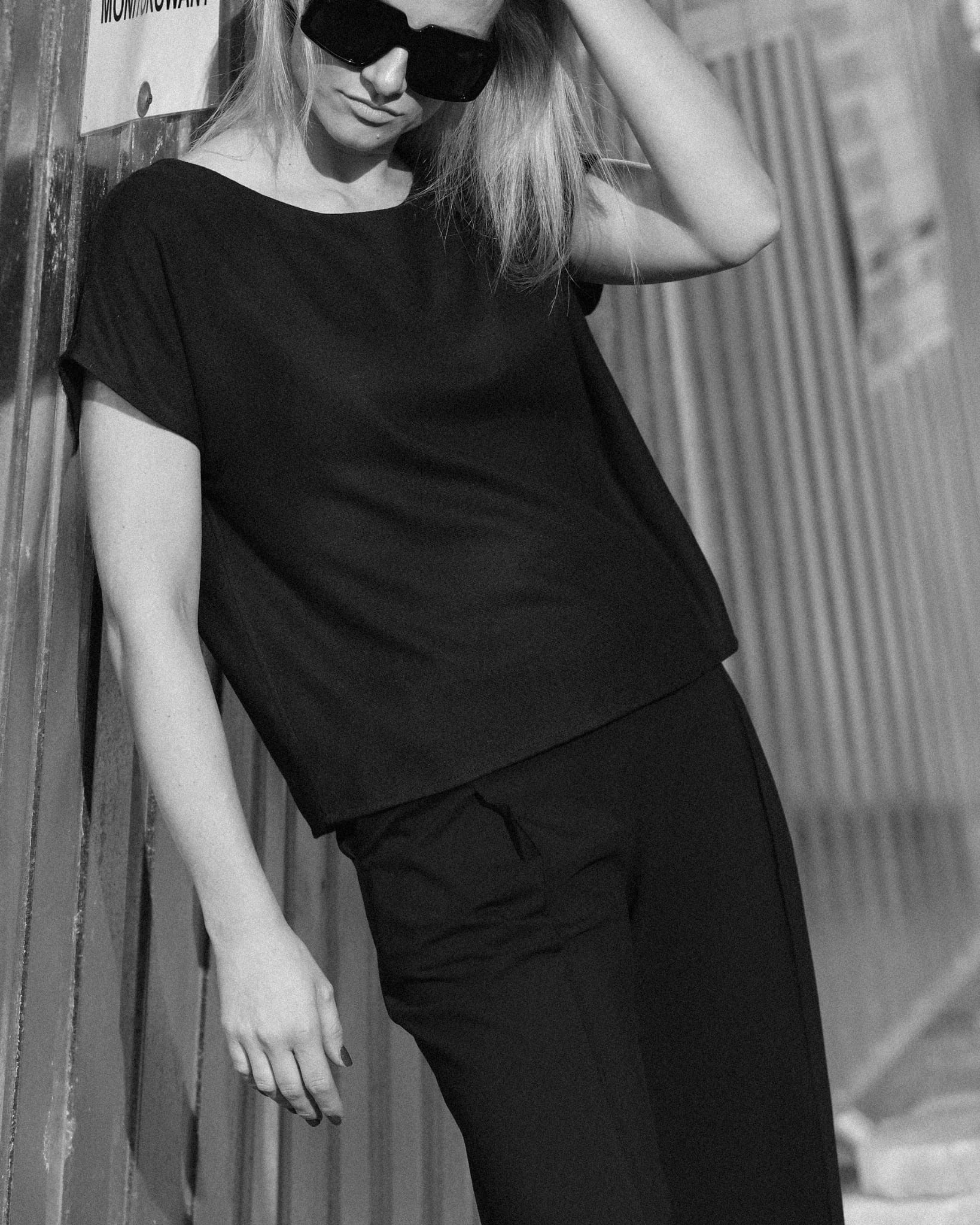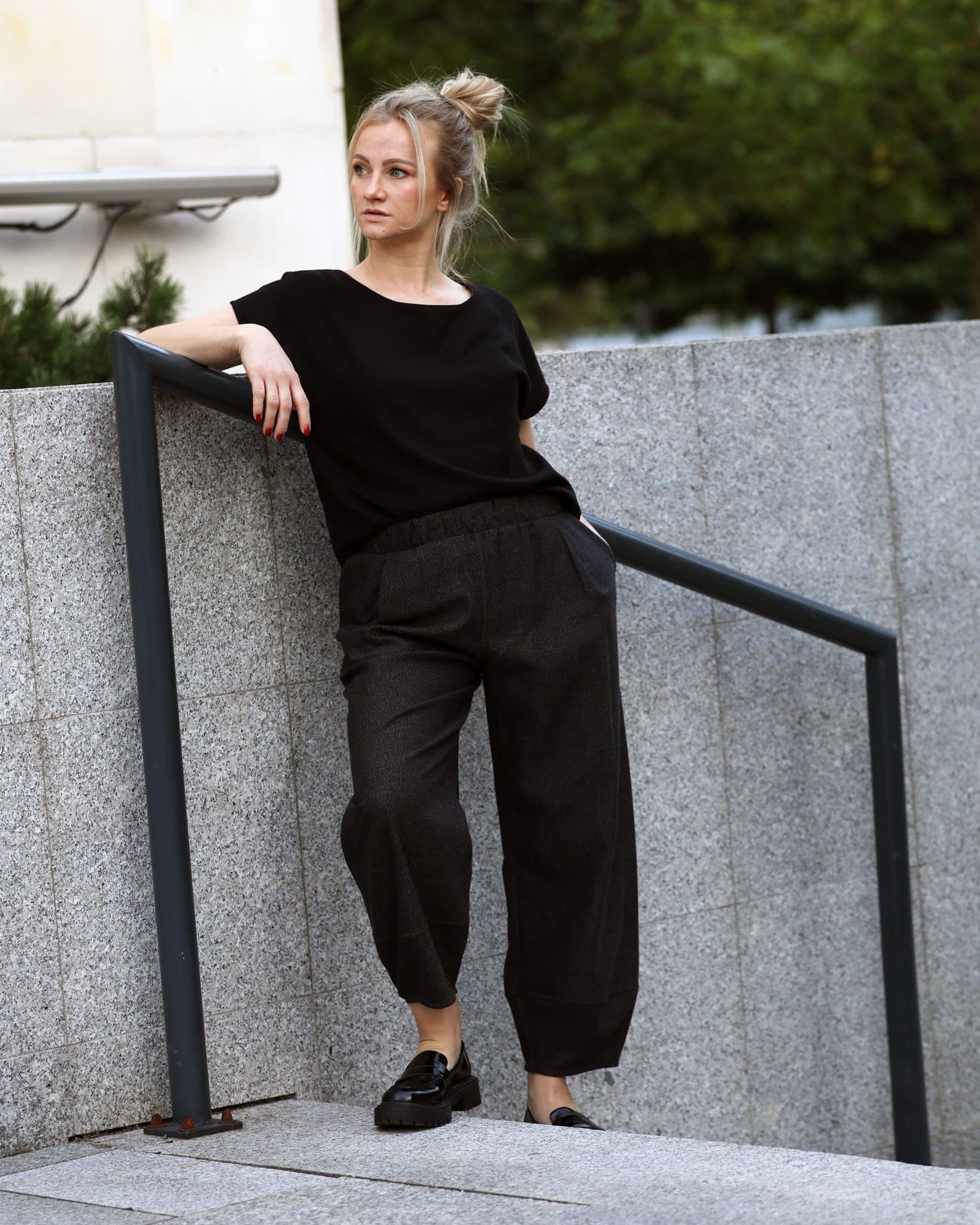Swobodna bluzka oversize o pudełkowym kroju, wykonana z wysokogatunkowej tkaniny wełnianej. Klasyczna i uniwersalna forma. Dekolt bluzki wykończony jest łagodnym łukiem.