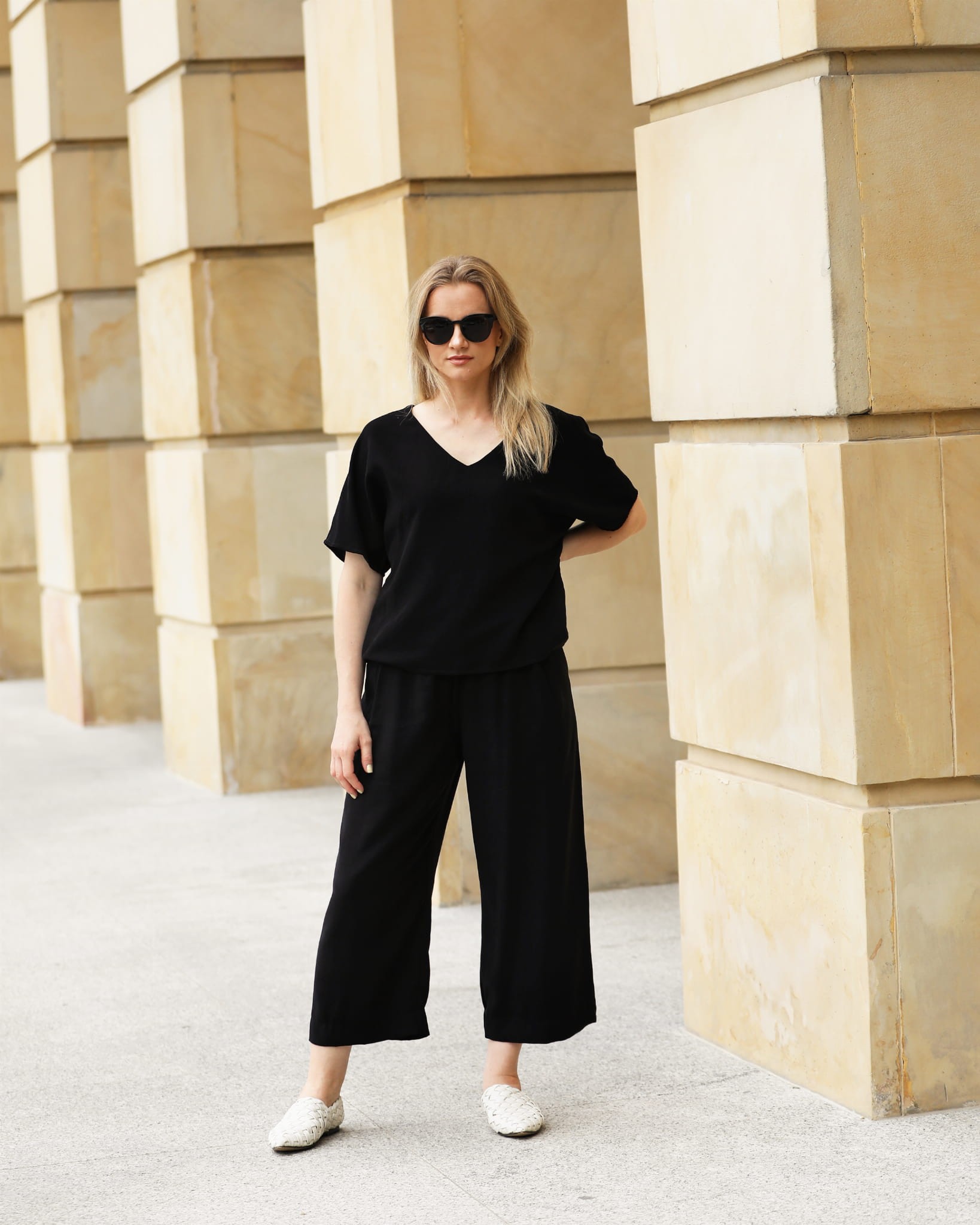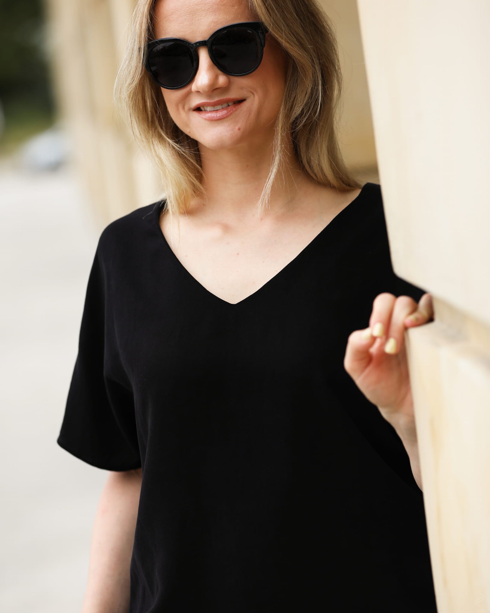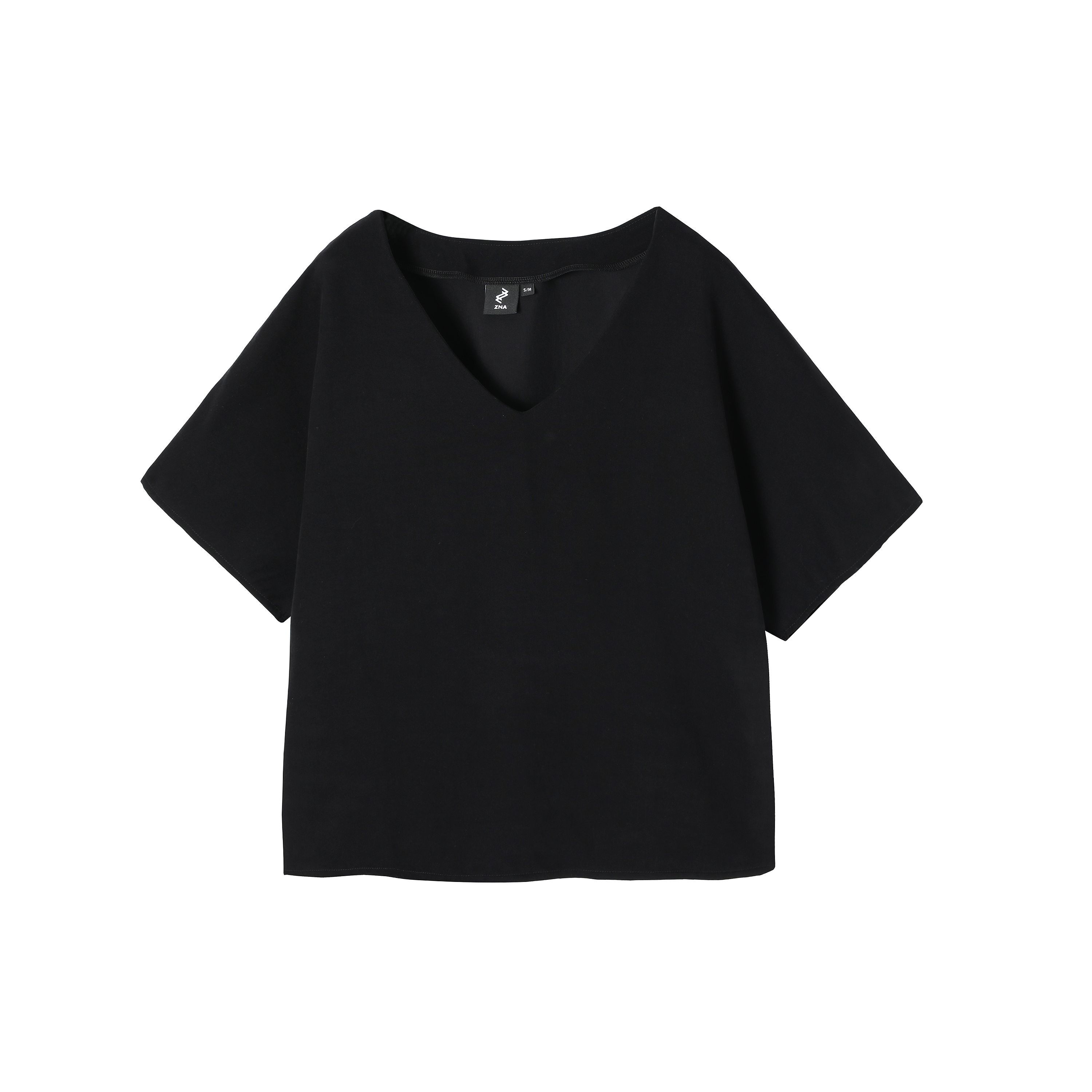 Swobodna bluzka oversize o pudełkowym kroju. Kobieca linia dekoltu łagodnie układa się w kształt litery V. Wykonana z wysokogatunkowej tkaniny wiskozowej. Tkanina jest mięsista i lejąca, a jej powierzchnia sprawia wrażenie zamszowej.