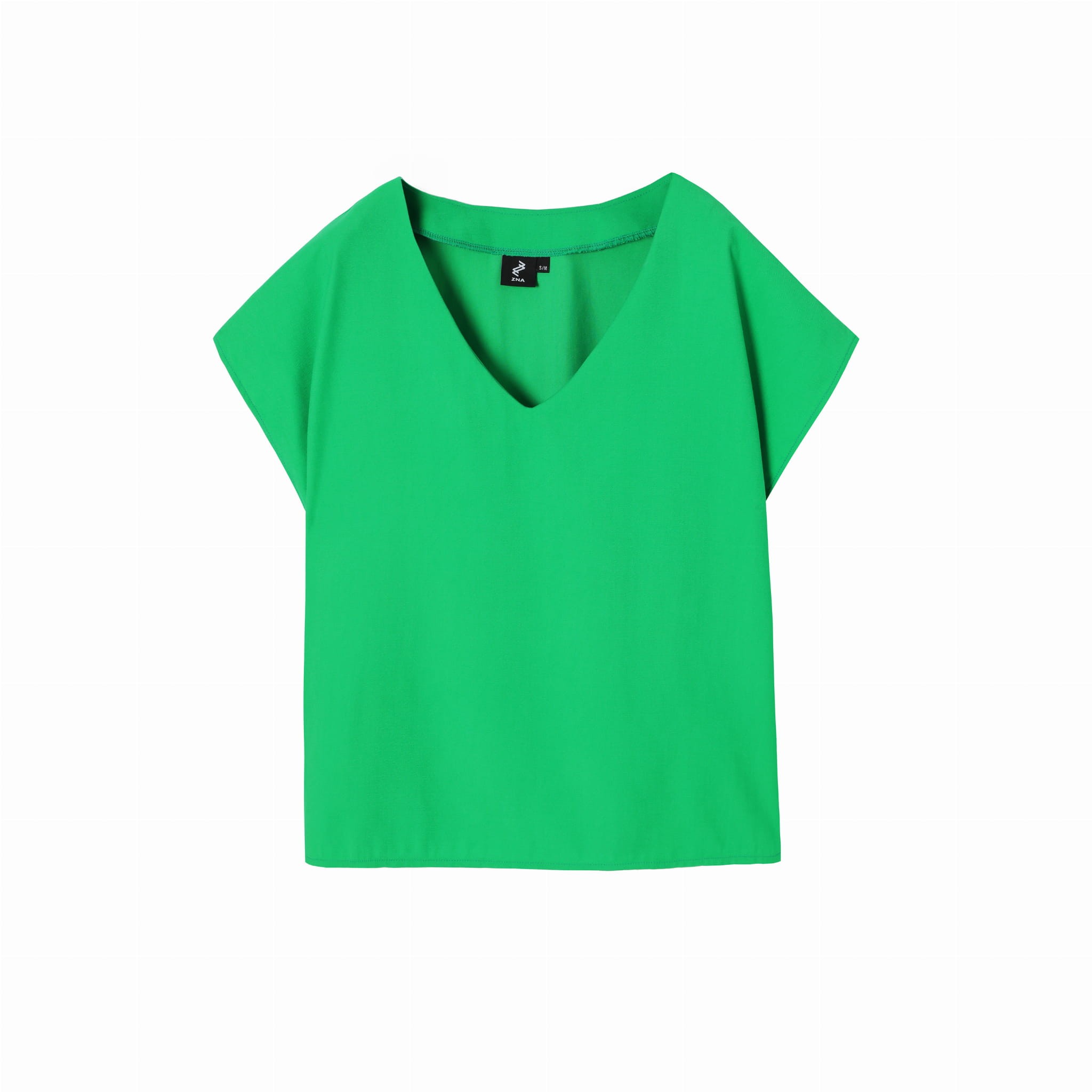 Swobodna bluzka oversize o pudełkowym kroju. Kobieca linia dekoltu łagodnie układa się w kształt litery V. Wykonana z wysokogatunkowej tkaniny wiskozowej. Tkanina jest mięsista i lejąca, a jej powierzchnia sprawia wrażenie zamszowej.